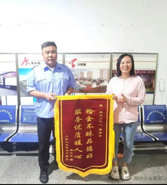 經(jīng)多方溝通,單師傅成功與郭女士取得聯(lián)系。當(dāng)日下午,郭女士趕到調(diào)度室核對(duì)信息后,單師傅將手包完整歸還。面對(duì)失而復(fù)得的財(cái)物,郭女士激動(dòng)不已,連連稱(chēng)贊單師傅拾金不昧品德高尚,服務(wù)貼心溫暖人心。為表達(dá)深切謝意,郭女士專(zhuān)程將一面繡有“拾金不昧品德好,服務(wù)優(yōu)質(zhì)暖人心”的錦旗送至公司,親手交到單相凈師傅手中。