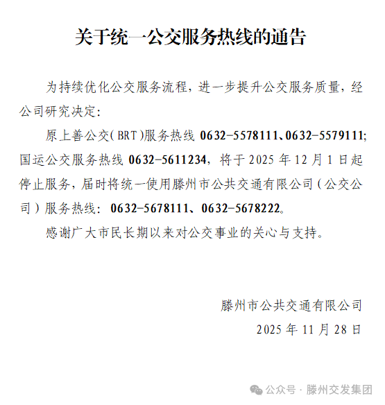 關(guān)于統(tǒng)一公交服務(wù)熱線的通告