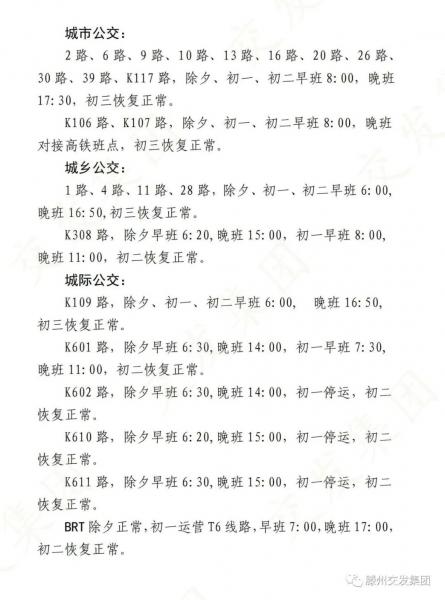 為方便市民春節(jié)期間出行,結(jié)合客流實際,現(xiàn)將春節(jié)期間集團(tuán)各運(yùn)營線路運(yùn)營時間進(jìn)行調(diào)整,敬請各位乘客相互轉(zhuǎn)告,合理安排出行。順祝各位新春快樂,闔家幸福!