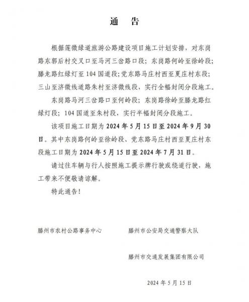 關(guān)于東崗路、滕龍路、黨東路部分路段封閉施工的通告